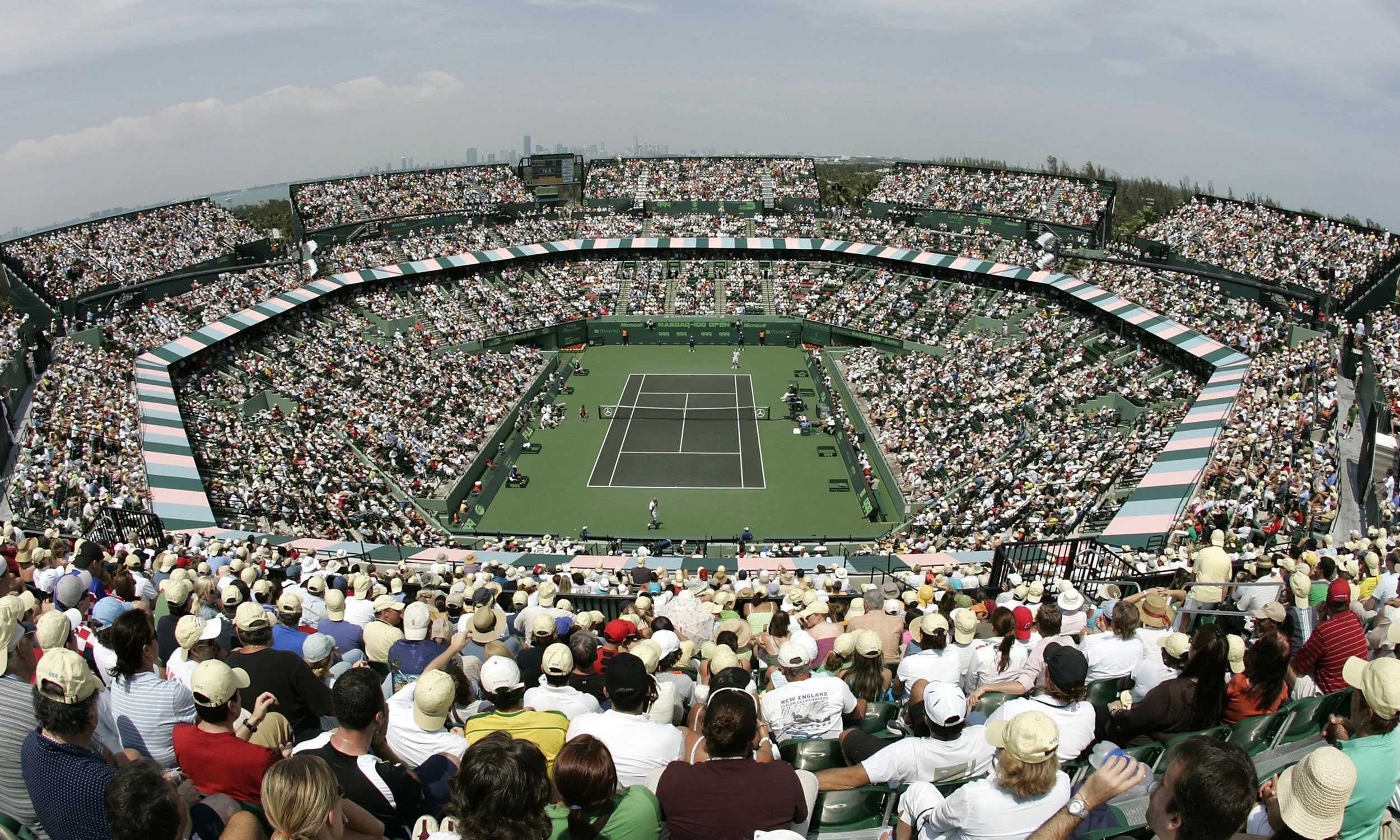 The Miami Open’s inaugural edition took place in Delray Beach in 1985, before moving to Boca West the following year, then finding a long-term home at Crandon Park in 1987. For over 30 years, Crandon Park was synonymous with the tournament, with its signature green and purple courts set against the breathtaking backdrop of quintessential Key Biscayne palm trees and bright blue waters.
